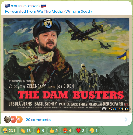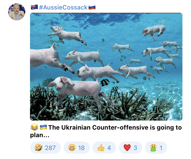 He’s extremely active poster, typically posting~15 times per day on his channel. He also does videos & organizes rallies, like any effective fifth columner would. After the explosion at the Nova Kakhovka dam, he shared a picture that depicted drowning Ukrainian civilians as pigs.
