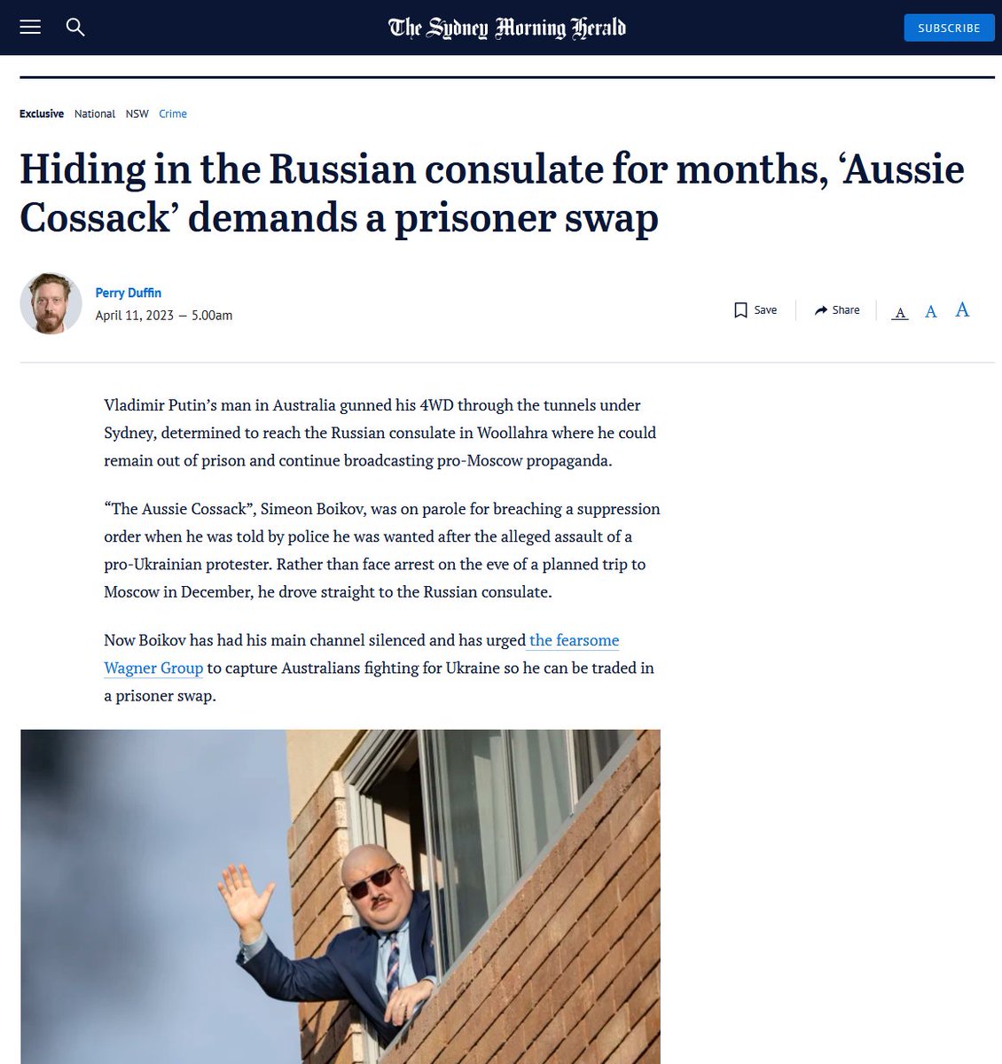 In today’s #vatniksoup, I’ll introduce an Australian LARPer and political commentator, Simeon “Aussie Cossack” Boikov. He’s best-known for rallying neo-Nazi groups to pro-Kremlin demonstrations, for assaulting the elderly, and for hiding in the Russian consulate in Sydney.