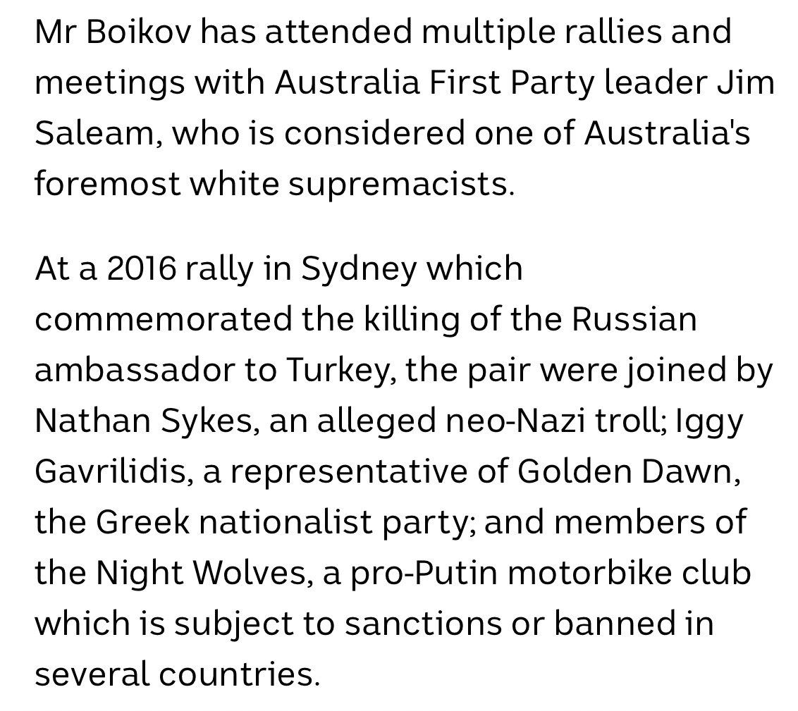 Throughout the years, Boikov has worked for with Australian neo-Nazis and far-right groups like the Serbian Chetniks, the Greek Golden Dawn, and the Russian Night Wolves. He’s been able to rally these groups to join him in anti-Ukraine demonstrations around Australia. While Boikov is complaining about “Ukrainian Nazis”, he’s collaborating with literal Nazi collaborators like the Serbian ultra-nationalist guerrilla group The Chetniks.