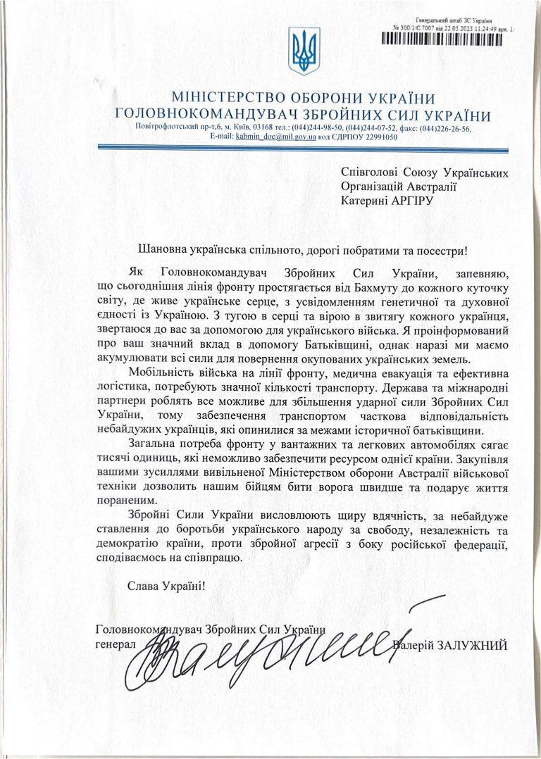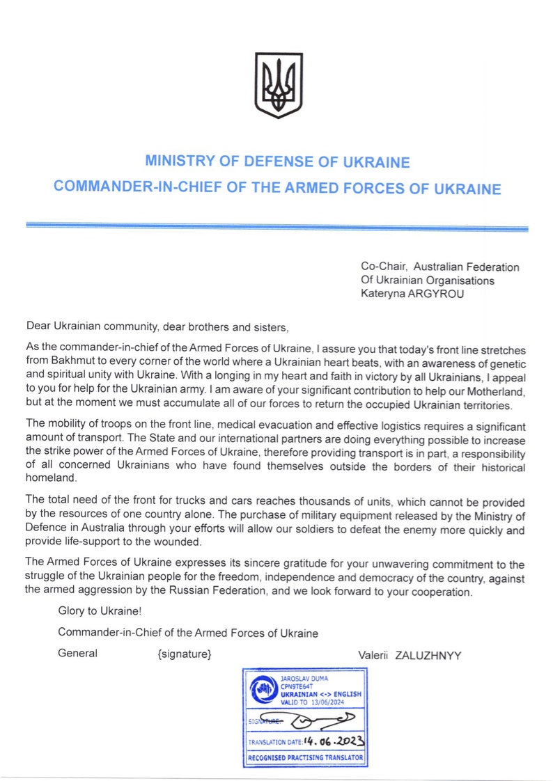 Announced at rallies in Melbourne, Sydney, Brisbane, Hobart and Canberra, the initiative arose from a letter written by the Commander-in-Chief of the Ukrainian Armed Forces, General Valerii Zaluzhnyy, to the AFUO Co-Chair, Ms Kateryna Argyrou, a month ago which asked the Australian-Ukrainian community and supporters of Ukraine to purchase used utes and trucks and transport them to Ukraine.