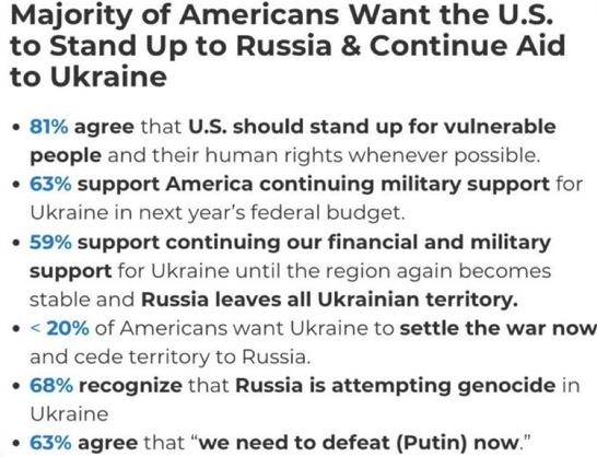 The Pew Research Centre’s July 2023 poll showed that Americans have a 90% unfavourable rating for Russia. Razom and Change Research’s August 2023 poll showed a 63% support for continuing to provide military aid to Ukraine, compared to 31% against.