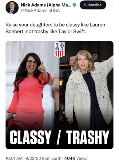 - Making very personal attacks on Taylor Swift in response to her Instagram post encouraging Voter Registration; and
